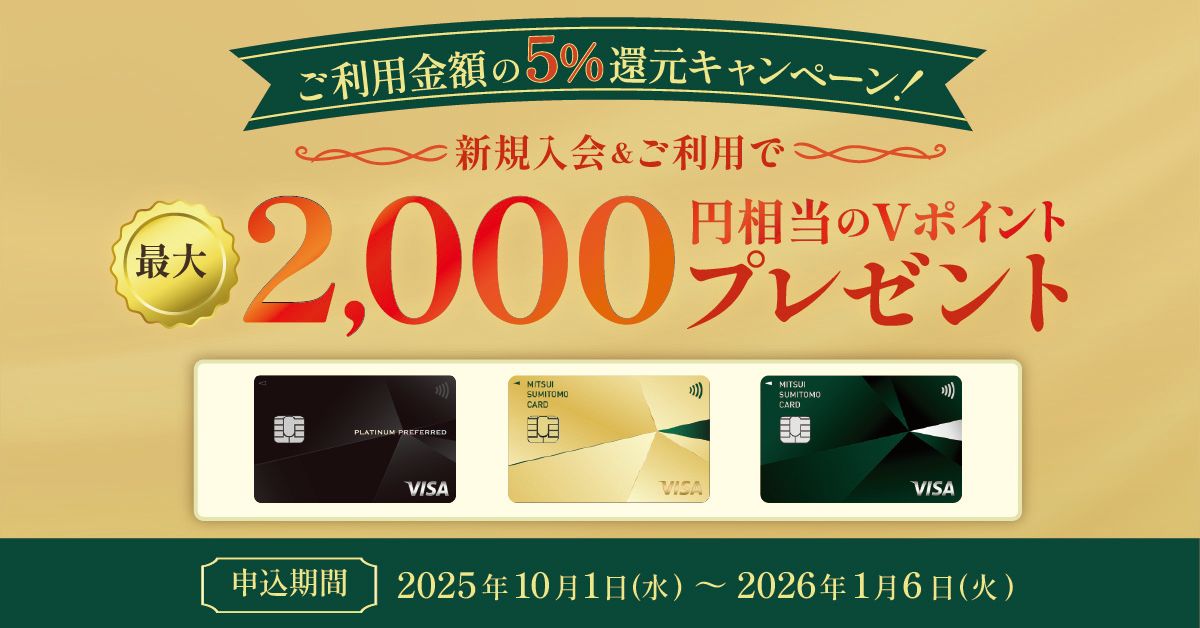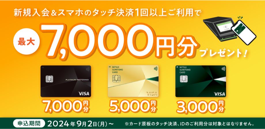 三井住友カード ゴールドNLに新規入会し、翌月末までにスマホのタッチ決済(Mastercard、Visa)を1回以上利用すると5,000円分のVポイントPayギフトがプレゼントされます。
